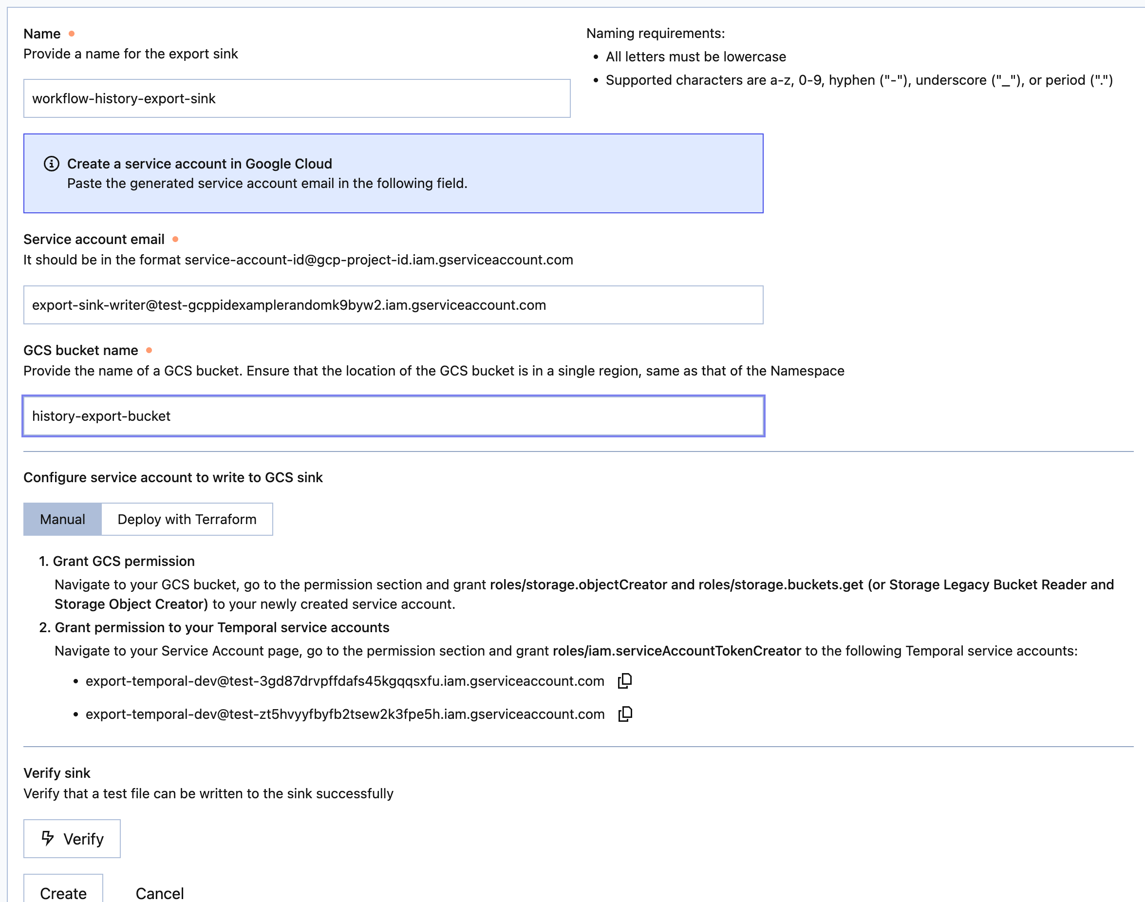 2. Create a service account in the same project that grants Temporal permission to write to your GCS bucket.